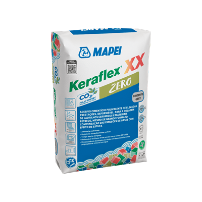 Keraflex XX Zero é um pó cinzento composto por cimento, areia de granulometria selecionada, uma elevada quantidade de resinas sintéticas e aditivos especiais segundo uma fórmula desenvolvida nos laboratórios de investigação MAPEI. As emissões residuais de gases com efeito de estufa (expressas em CO₂) do Keraflex XX Zero são compensadas anualmente com a compra de créditos ambientais certificados: Keraflex XX Zero tem, portanto, impacto zero nas alterações climáticas. Keraflex XX Zero tem baixíssimas emissões de VOC (Compostos Orgânicos Voláteis), e salvaguarda a qualidade do ar interior e da saúde de instaladores e de utilizadores finais. O produto é assim certificado como EC1 Plus. Quando misturado com água forma argamassa com as seguintes características: boa trabalhabilidade; se misturado com 6,75-7,25 litros de água (classe C2TES1) ganha alta tixotropia: Keraflex XX Zero pode ser aplicado em superfícies verticais sem escorrer ou deixar que os ladrilhos deslizem; se misturado com 7,5-8,0 litros de água (classe C2ES1), o tempo aberto é melhorado. A excelente transferência do adesivo permite molhar perfeitamente as costas dos ladrilhos; tempos de abertura e ajuste alongados, para facilitar as operações de assentamento; boa capacidade de absorver deformações no suporte e nos ladrilhos. Adesivo de classe S1: deformação transversal > 2,5 mm medida de acordo com o método descrito na norma EN 12004.