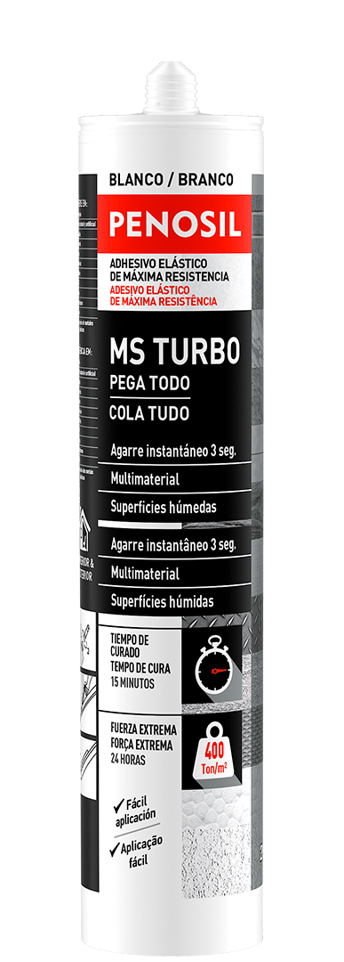 PENOSIL MS TURBO é um potente adesivo elástico de máxima resistência à base de polímero MS, com agarre imediato e elevadas prestações finais. Excelente adesão à maioria dos materiais, e adere inclusive em superfícies húmidas, Uniões rápidas, elásticas, resistentes e duráveis, na construção e na indústria.