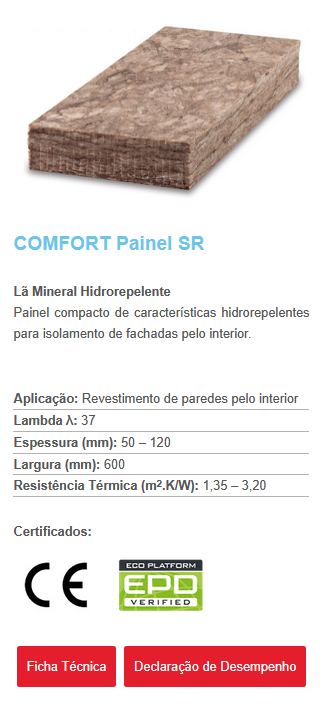 Lã Mineral em Painel. Lã Mineral Hidrorrepelente. Painel compacto de características hidrorrepelentes para isolamento de fachadas pelo interior.